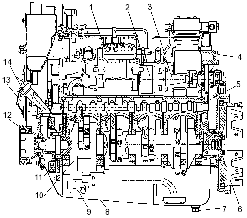 ТНВД; 4 — картер маховика; 5 — распределительный вал; 6 — маховик; 7 — пробка