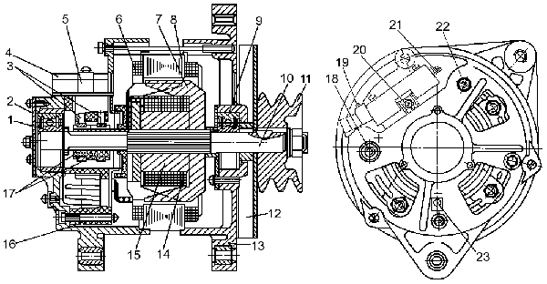 Генератор состоит из следующих частей: статора, ротора, крышки со стороны контактных колец со встроенным выпрямительным блоком, имеющим три дополнительных диода; крышки со стороны привода, щеткодержателя с интегральным регулятором напряжения, вентилятора и шкива.