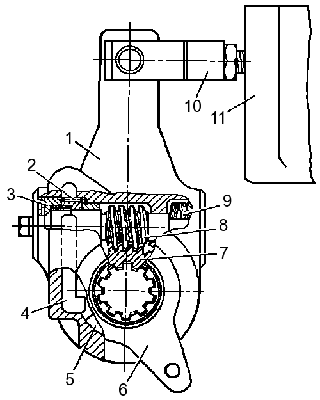 суппорт; 5 — кронштейн с втулками; 6 — регулировочный рычаг; 7 — палец; 9 —
