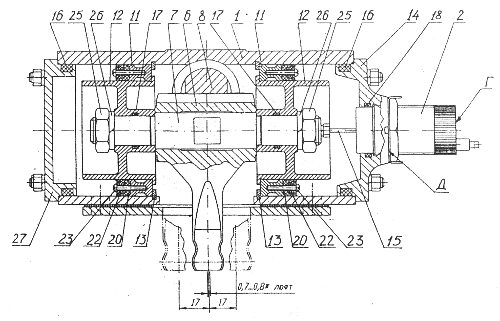поршень-наездник; 12 — поршень; 13 — кольцо упорное; 14 — крышка; 15 — индуктор;