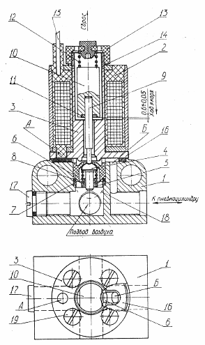 При выключении электромагнита под действием пружины 7 клапан впускной 4 закрывается, а клапан выпускной 11 открывается. Воздух из рабочих пневмоцилиндров через отверстие Б, клапан 11, зазоры между якорем 10 и корпусом сердечника 3 и отверстий в гайке 13 выходит в атмосферу.