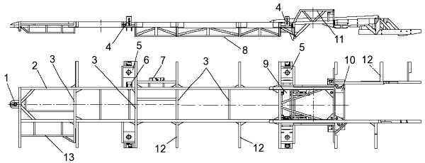 ферма над колесами заднего моста; 12 — балки для крепления кузова; 13 — ферма