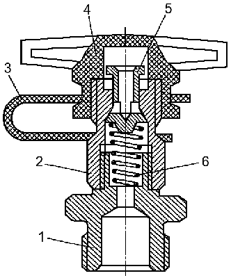 При измерении давления или отборе сжатого воздуха нужно отвернуть колпачок 4 клапана и навернуть на корпус 2 накидную гайку шланга, подсоединенного к контрольному манометру или какому-либо потребителю. При наворачивании гайка перемещает толкатель 5 с клапаном, клапан отрывается от седла в корпусе 2, и воздух через отверстие в толкателе 5 поступает в шланг. После отсоединения шланга клапан под действием пружины 6 прижимается к седлу в корпусе 2, закрывая выход сжатому воздуху из пневмопривода.