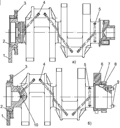 Подвод масла к шатунным шейкам производится через отверстия 5 в коренных и отверстия 4 в шатунных шейках (см. Рисунок 31 — Коленчатый вал).