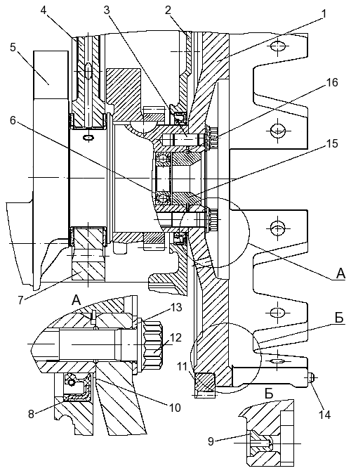 маховика; 15 — выборка под дисбаланс; 16 — болт крепления маховика; 17 — шайба;