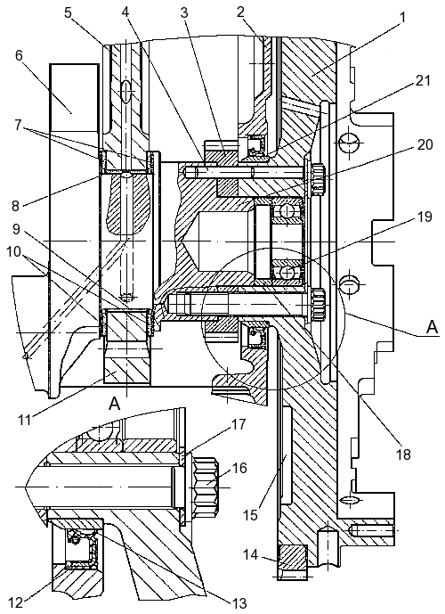 18 — втулка дистанционная; 19 — подшипник; 20 — центрирующая шейка вала; 21 —