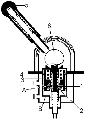 В положении «Отторможено» клапан 1 удерживает открытым проход между камерами А и В и подаваемый через вывод I сжатый воздух проходит через вход II в камеры пружинного энергоаккумулятора пневмоцилиндра. При повороте рукоятки 5 и срабатывании тормозной системы клапан 1 закрывает проход между камерами А и В.