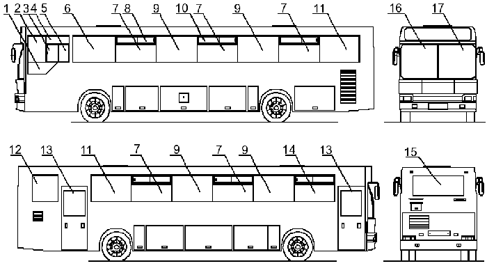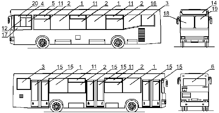 Рисунок 228 — Расположение стекол в автобусах НЕФАЗ 5299-0000010-01, НЕФАЗ 5299-0000010-16