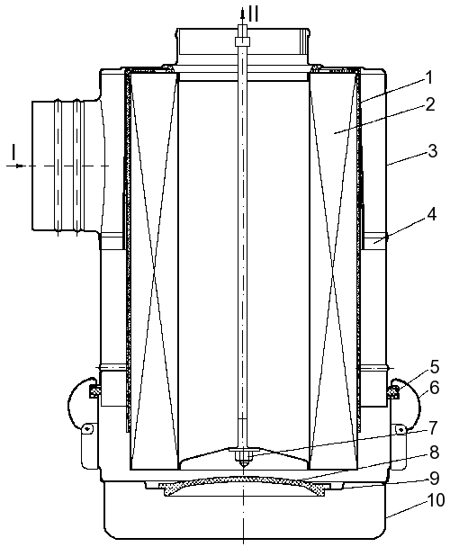 Первая ступень очистки — моноциклон, содержащий завихритель 4, установленный за входным патрубком и обеспечивающий винтовое движение воздушного потока в кольцевом зазоре между корпусом 3 фильтра и элементом 2. За счет действия центробежных сил частицы пыли отбрасываются к стенке корпуса и сгоняются в бункер. Пылесборный бункер образован крышкой 10, перегородкой 9 и съемной заглушкой 8.
