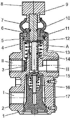 При отпускании кнопки 8 толкатель 9 под действием пружины 13 возвращается в верхнее положение. При этом клапан 15 закрывает отверстие в корпусе 2, прекращая дальнейшее поступление сжатого воздуха к выводу III, а седло толкателя 9 отрывается от клапана 15, сообщая вывод III с атмосферным выводом II. Сжатый воздух из вывода III через отверстие А в толкателе 9 выходит в атмосферный вывод II.