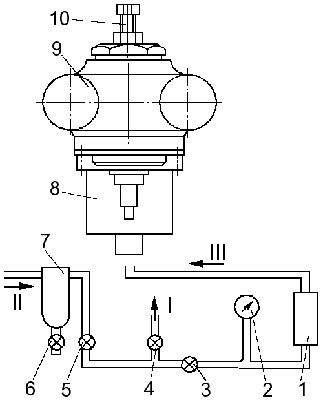 Установите корпус 9 насоса в приспособление, заполните аккумулятор 1 сжатым воздухом до давления не менее 539 кПа (5,5 кгс/см2), герметично отключите его от магистрали сжатого воздуха и замерьте время, в течение которого произойдет падение в аккумуляторе 490-392 кПа (5-4 кгс/см2). Полученное время сравните с аналогичными показаниями плотности эталонной прецизионной пары, имеющей зазор в сопряжении 0,012 мм. Пару замените или отремонтируйте, если плотность у нее меньше эталонной.
