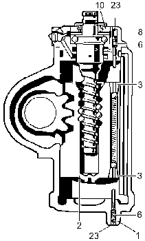 Верхний штифт ограничителя давления демонтируйте в корпусе клапанов Перед демонтажем верхнего штифта ограничителя давления тщательно очистите корпус [8]. Цангами вытащите пробку [23] над штифтом ограничителя давления. При помощи отвертки выверните штифт в корпусе против часовой стрелки, вращайте, пока резьба не выйдет из зацепления. |