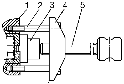 Для снятия подшипников карданного вала с круглыми фланцами нужно использовать съемник И801.33.000. Предварительно надо снять опорные пластины фланца-вилки, разогнув стопорную пластину, и вывернуть болты. Ввернуть болты 2 съемника (Рисунок 131 — Снятие съемником подшипников карданных валов) в отверстия вилки из-под болтов, упираясь наконечником 3 в подшипник, ввернуть винт 5 в траверсу 4 до выпрессовки смежного подшипника на (15-20) мм.