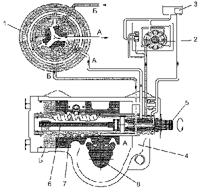 — поршень-рейка; 8 — вал сошки; А, Б — полости и линии нагнетания и